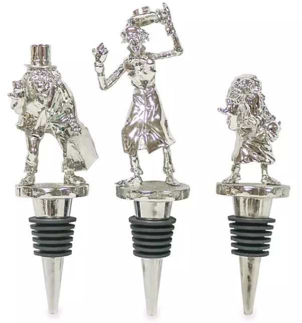 Fans of the wayfaring apparitions from The Haunted Mansion will give this Hitchhiking Ghosts Bottle Stopper Set three thumbs up. Crafted in metal with a chrome finish, the detailed figural sculpts of Ezra, Phineas, and Gus perch atop the tapered stoppers that feature a silicone gasket to keep your bottles air tight.