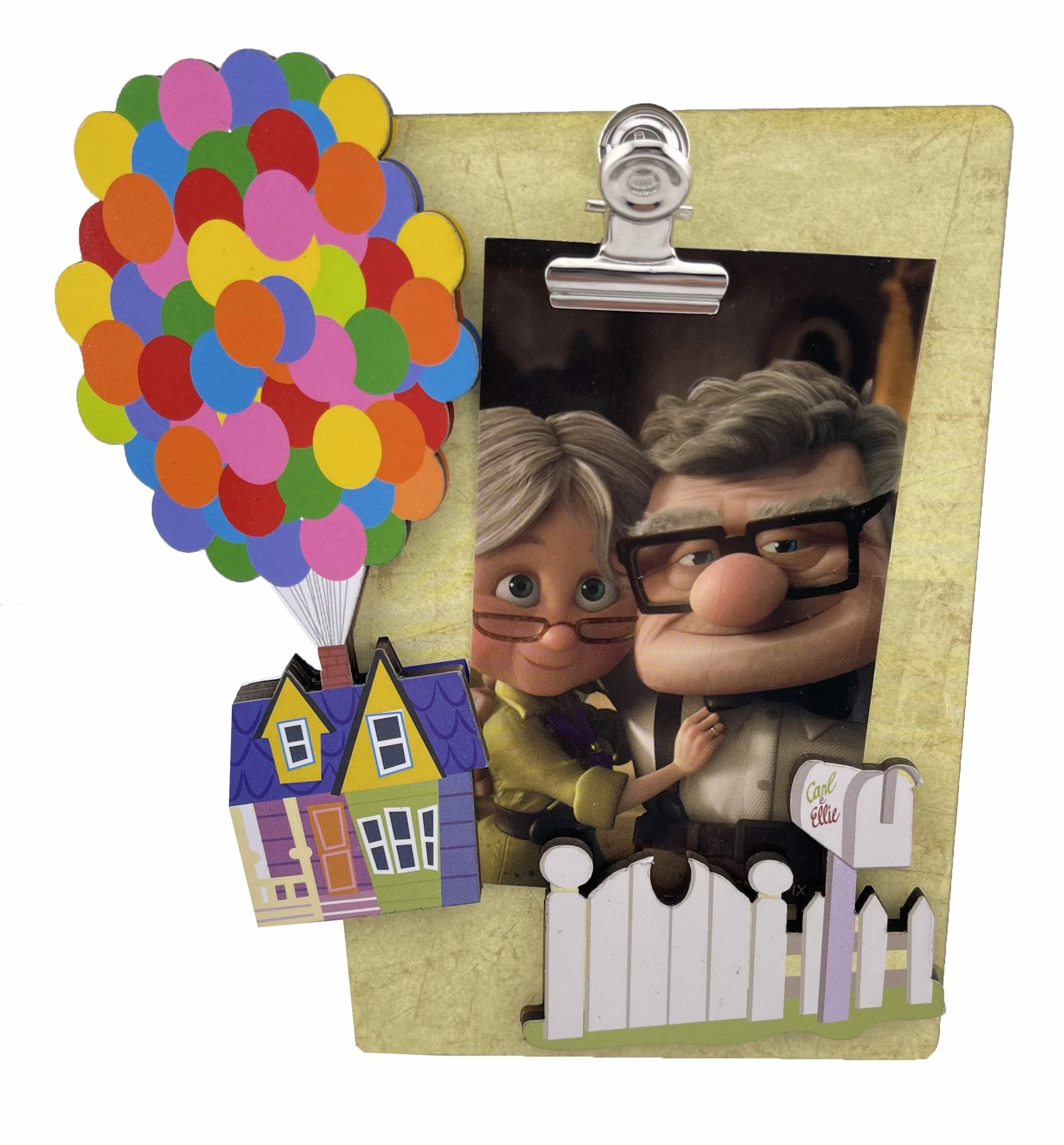 This Magnet Frame Features a Pixar UP design with a clip for a Photo. It also is Magnetic or it has a pull out Stand.