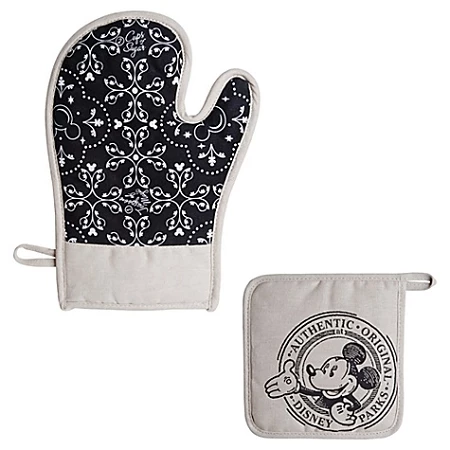 Host friends and family with our Gourmet Mickey home essentials. This nostalgic Mickey Mouse oven mitt and potholder set is a warm complement to any Disney kitchen.